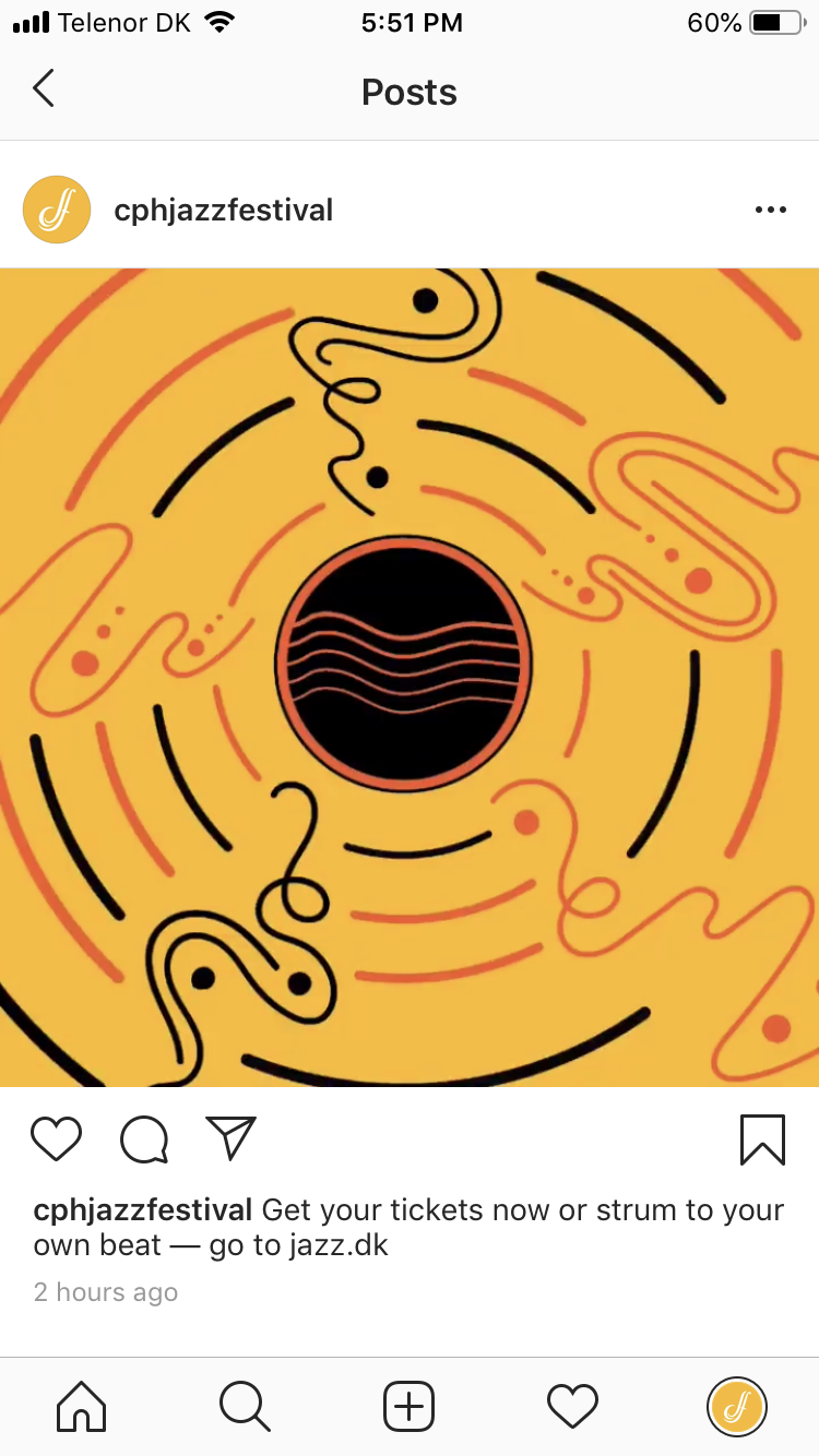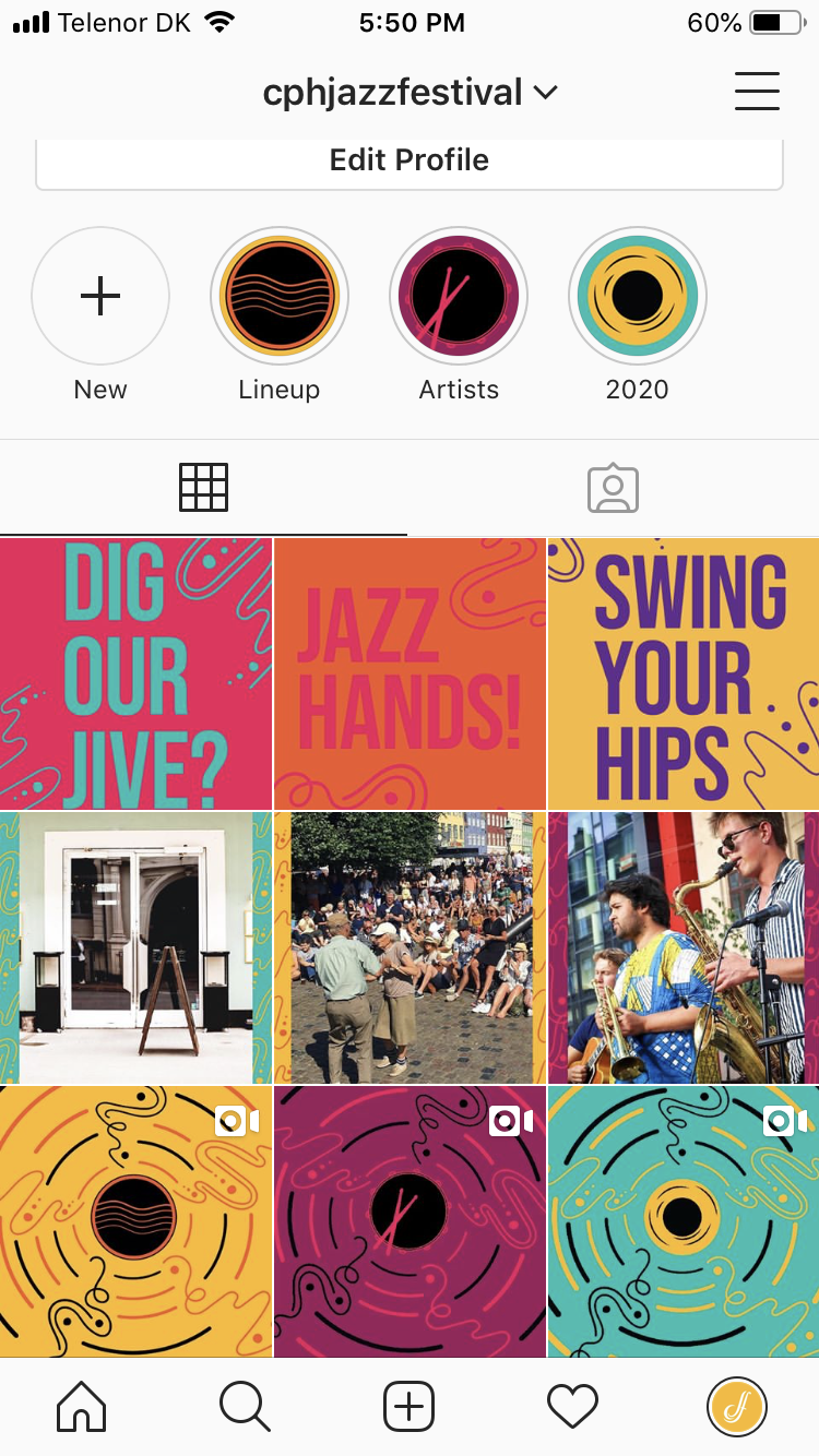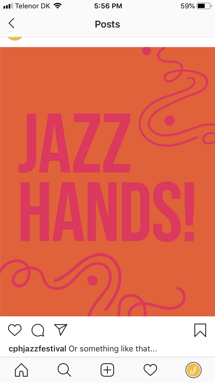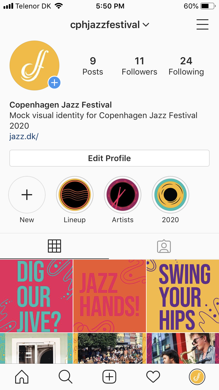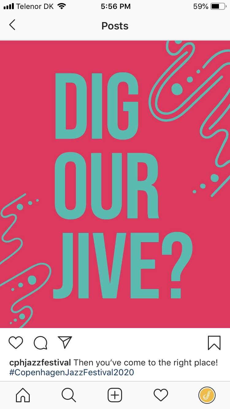 We were asked to create a new visual identity for the Copenhagen Jazz Festival. This included a logo, poster, tote bag, t-shirt, ticket, Instagram account, and one other relevant marketing material.