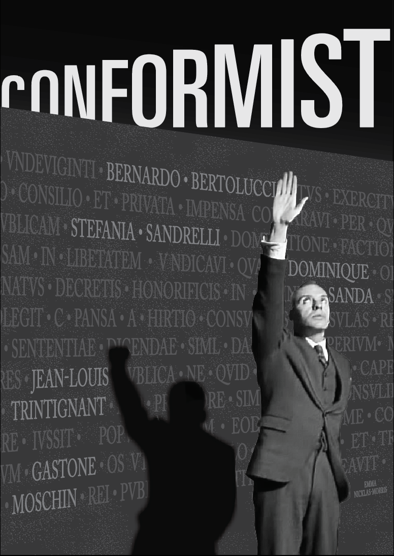 My final poster design is below. For the title, I did some more research on fascism and the time period and I discovered that fasces, a wooden bundle with an axe in the middle, was a symbol of fascism. It only seemed right to place that on the “I” in Conformist and have it bigger than the rest of the letters (because it doesn’t conform like the rest of the letters). I also decided to omitted “The” from the title because I thought the poster would not lose its value without it and for ascetic purposes.